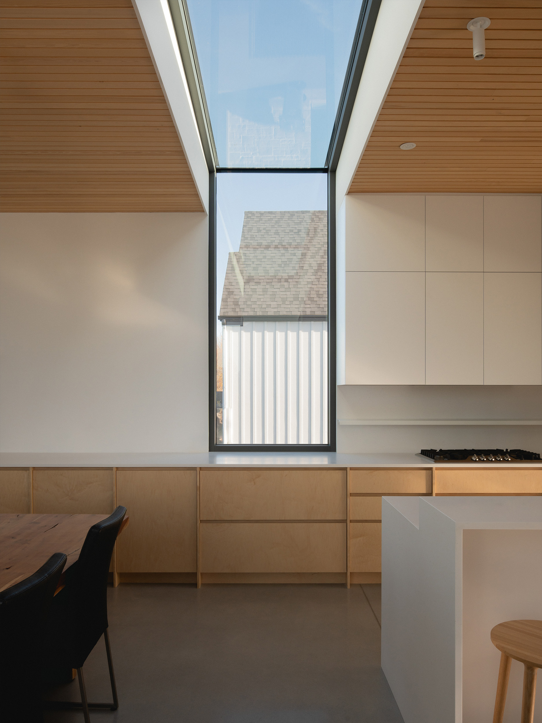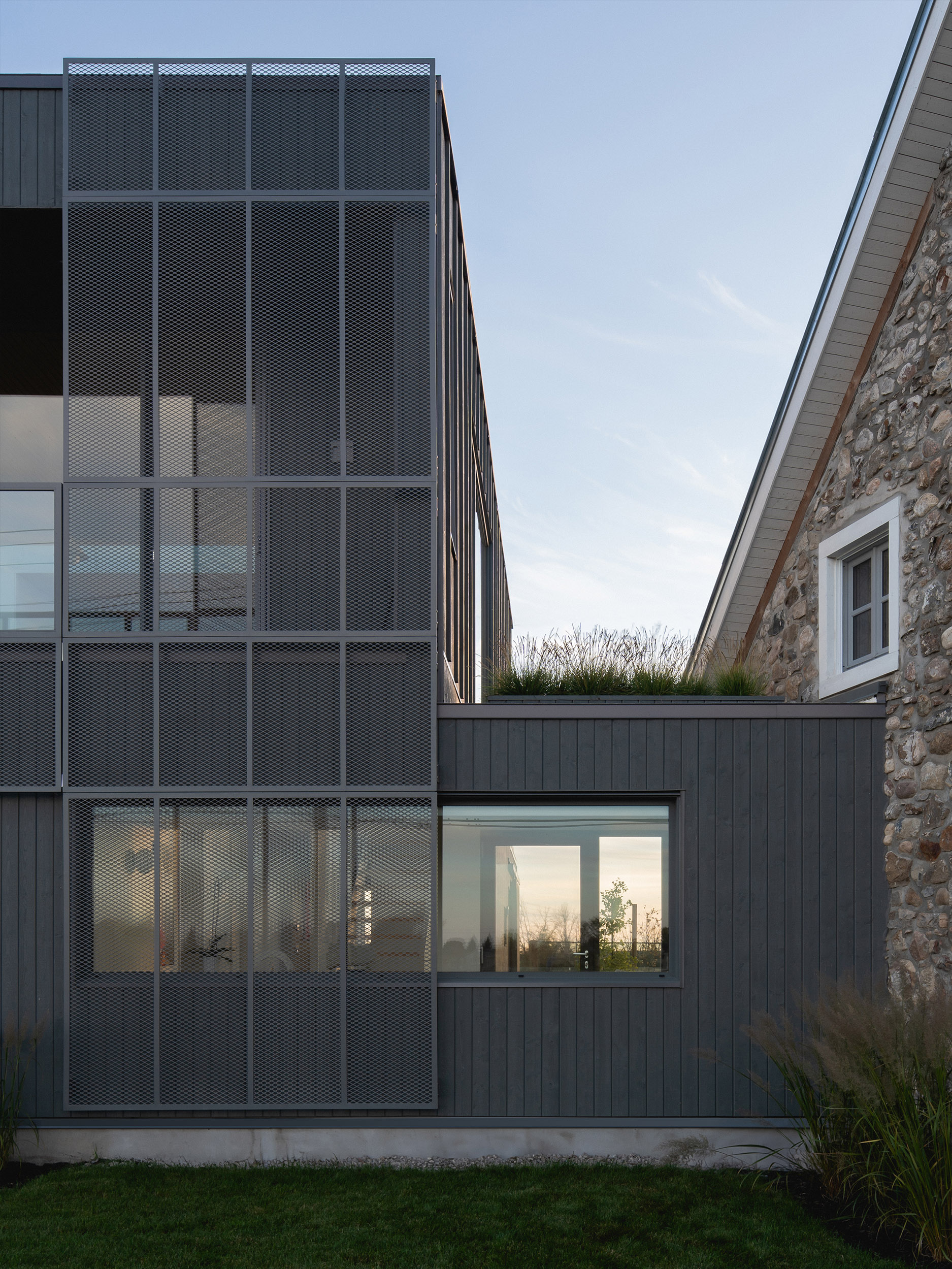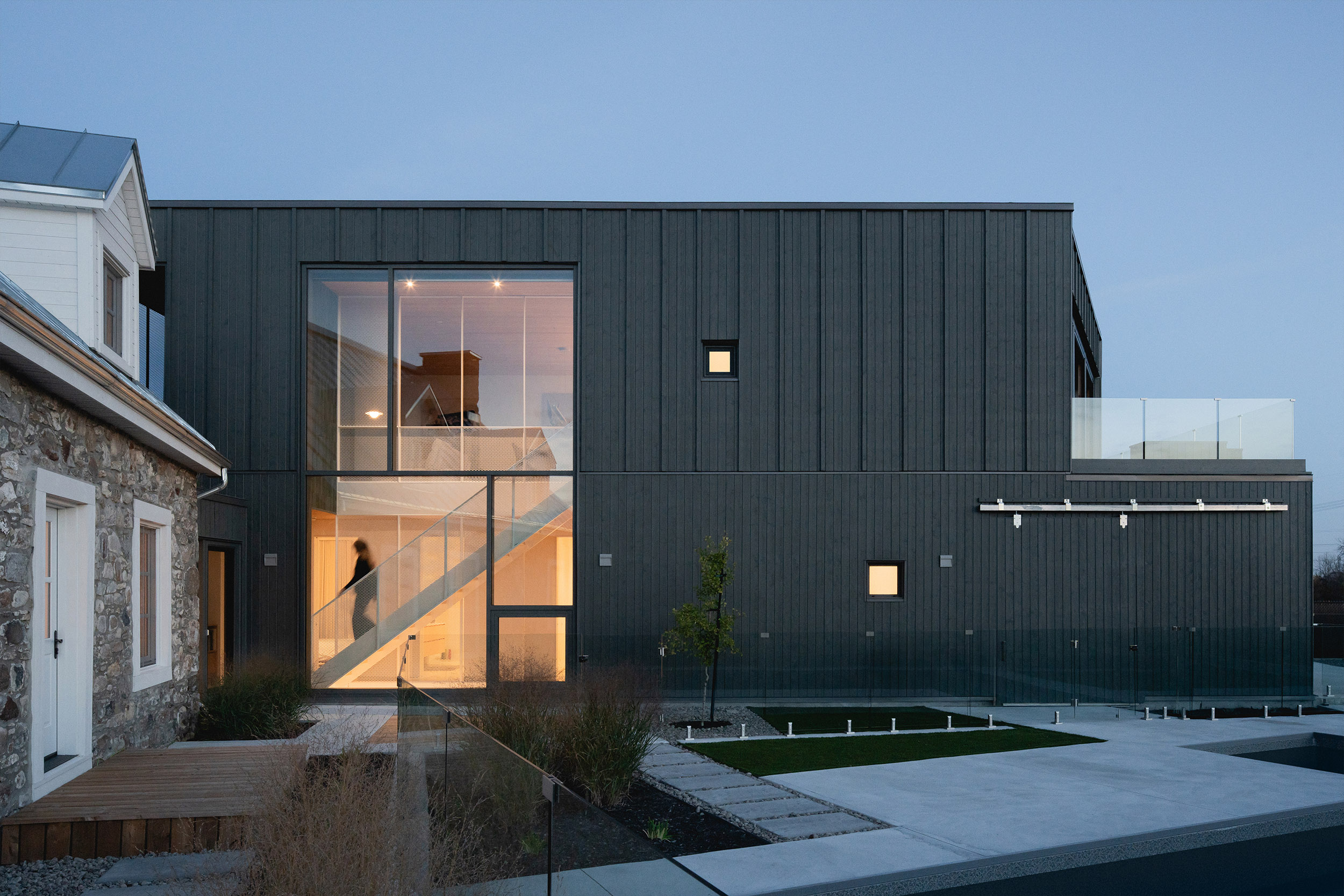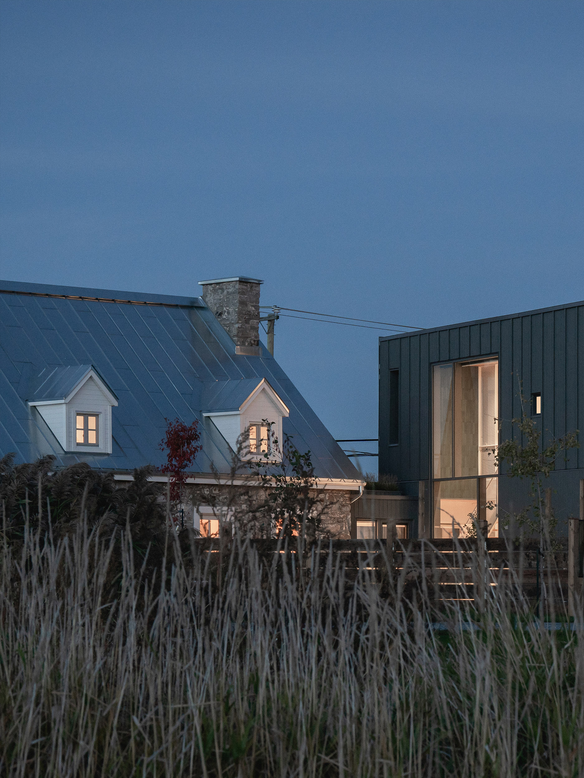 Set back and slightly angled in relation to the original house, the addition creates an intimate courtyard between the two volumes. Following the restoration, the maison Forget accommodates functions such as a workspace, studio, living room and kitchenette, while the extension gathers the bedrooms, kitchen, dining area and a lounge space.