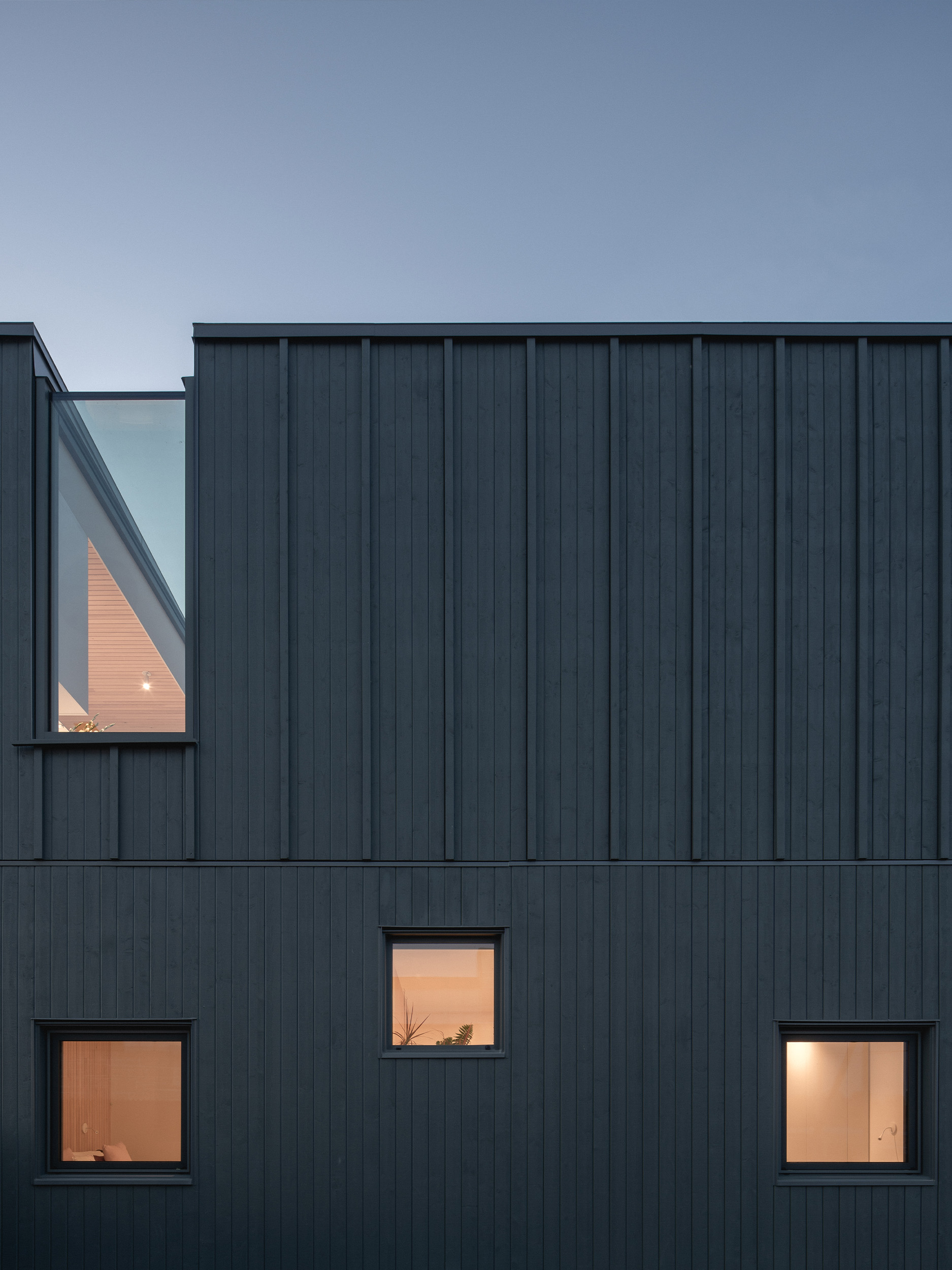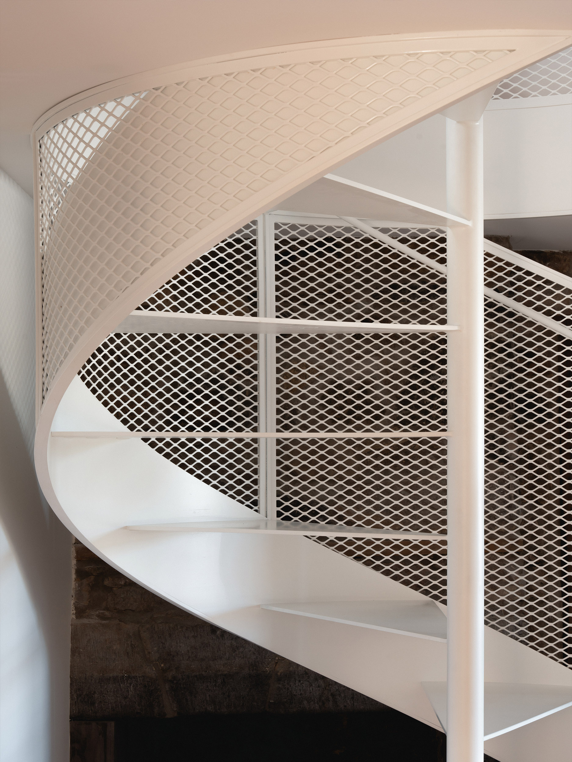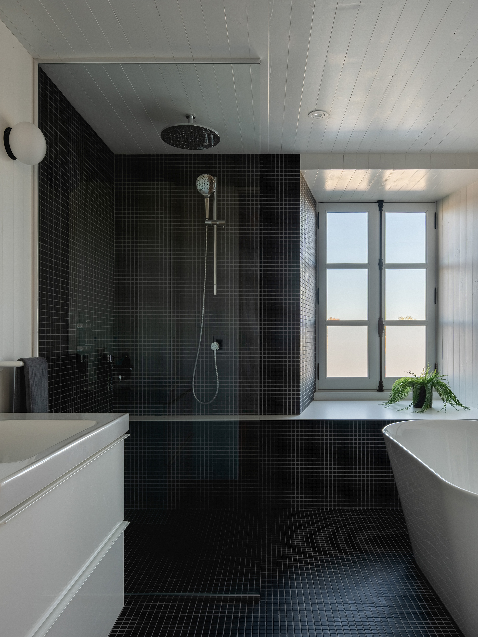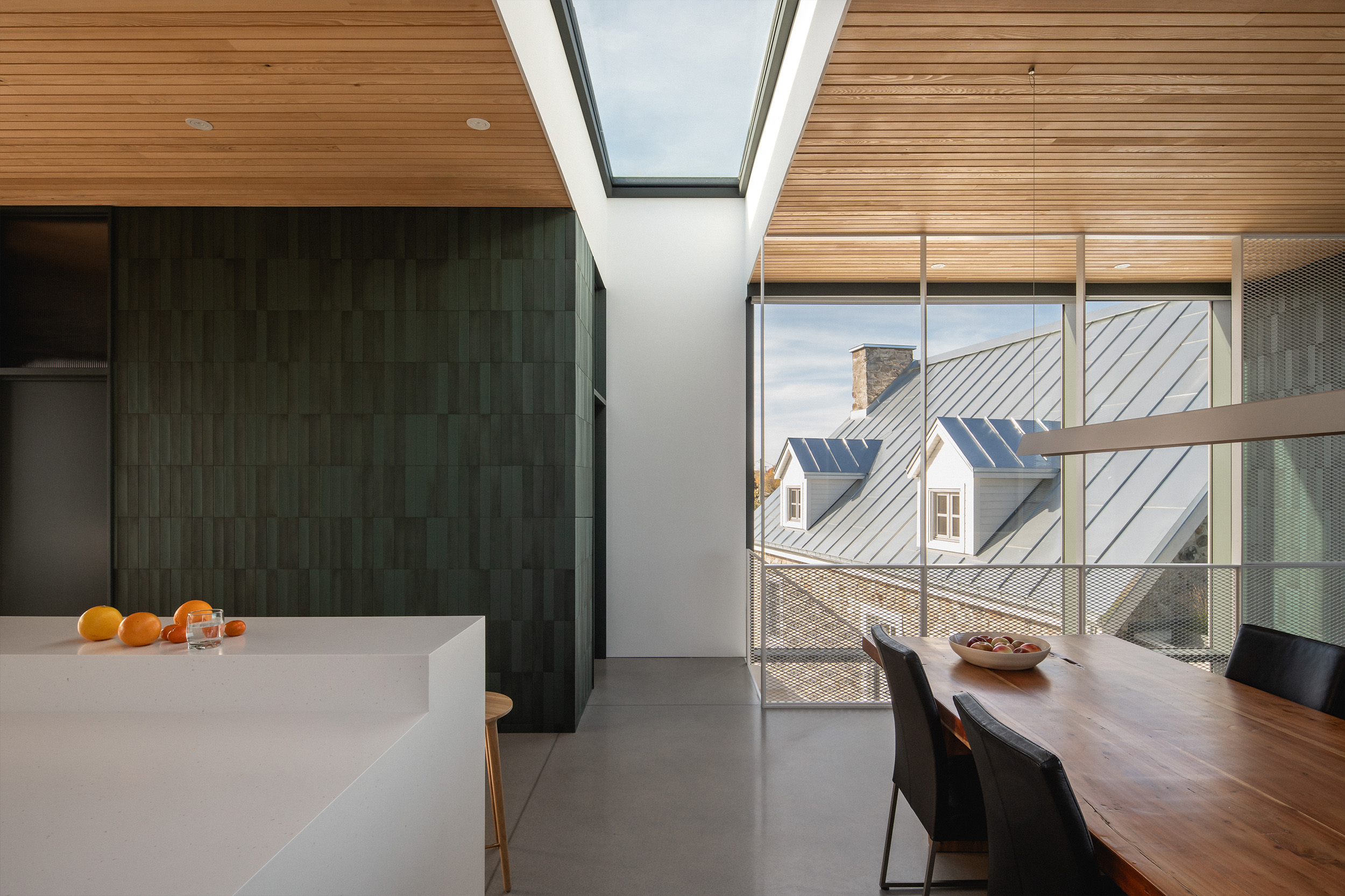 Set back and slightly angled in relation to the original house, the addition creates an intimate courtyard between the two volumes. Following the restoration, the maison Forget accommodates functions such as a workspace, studio, living room and kitchenette, while the extension gathers the bedrooms, kitchen, dining area and a lounge space.