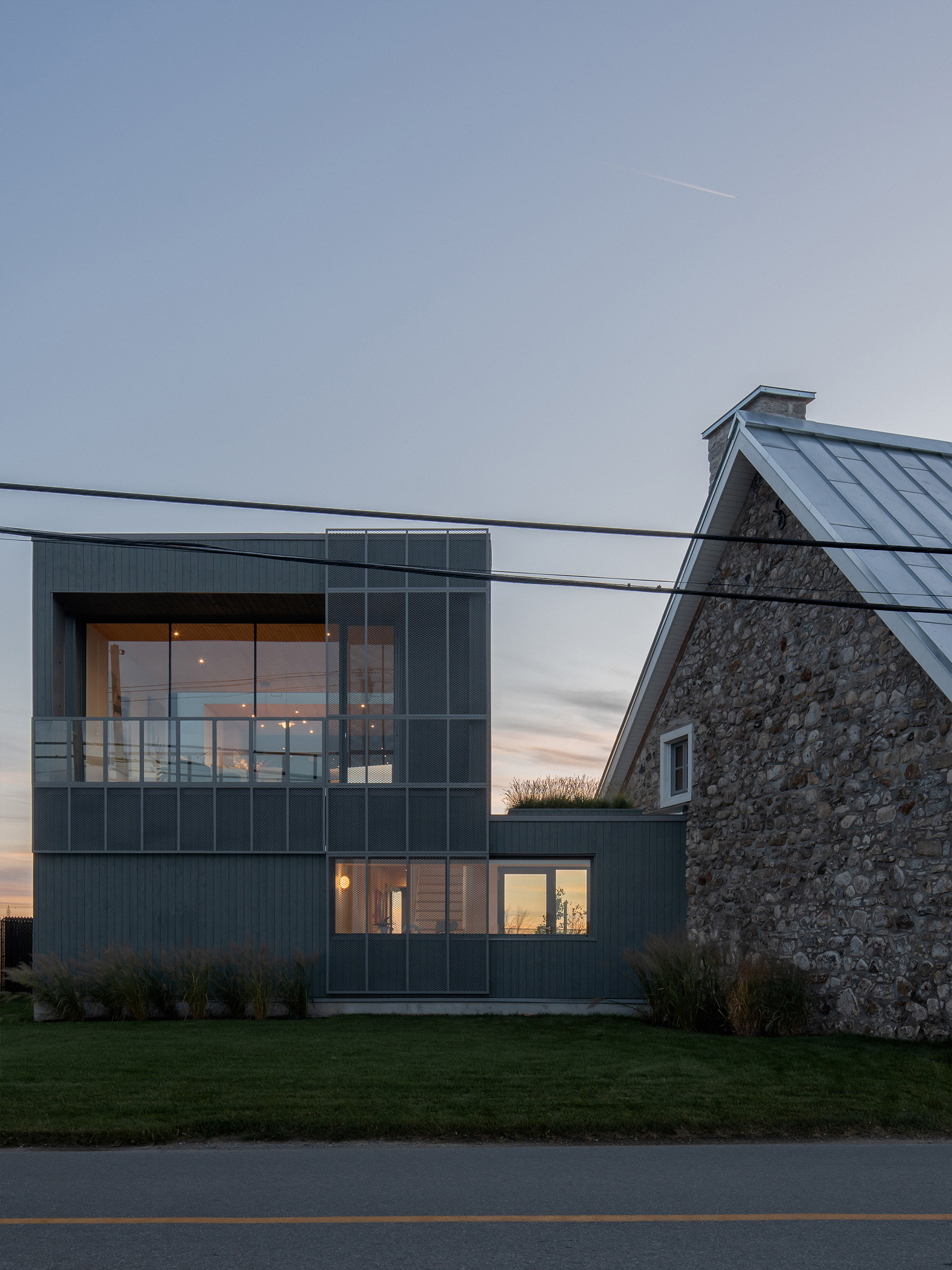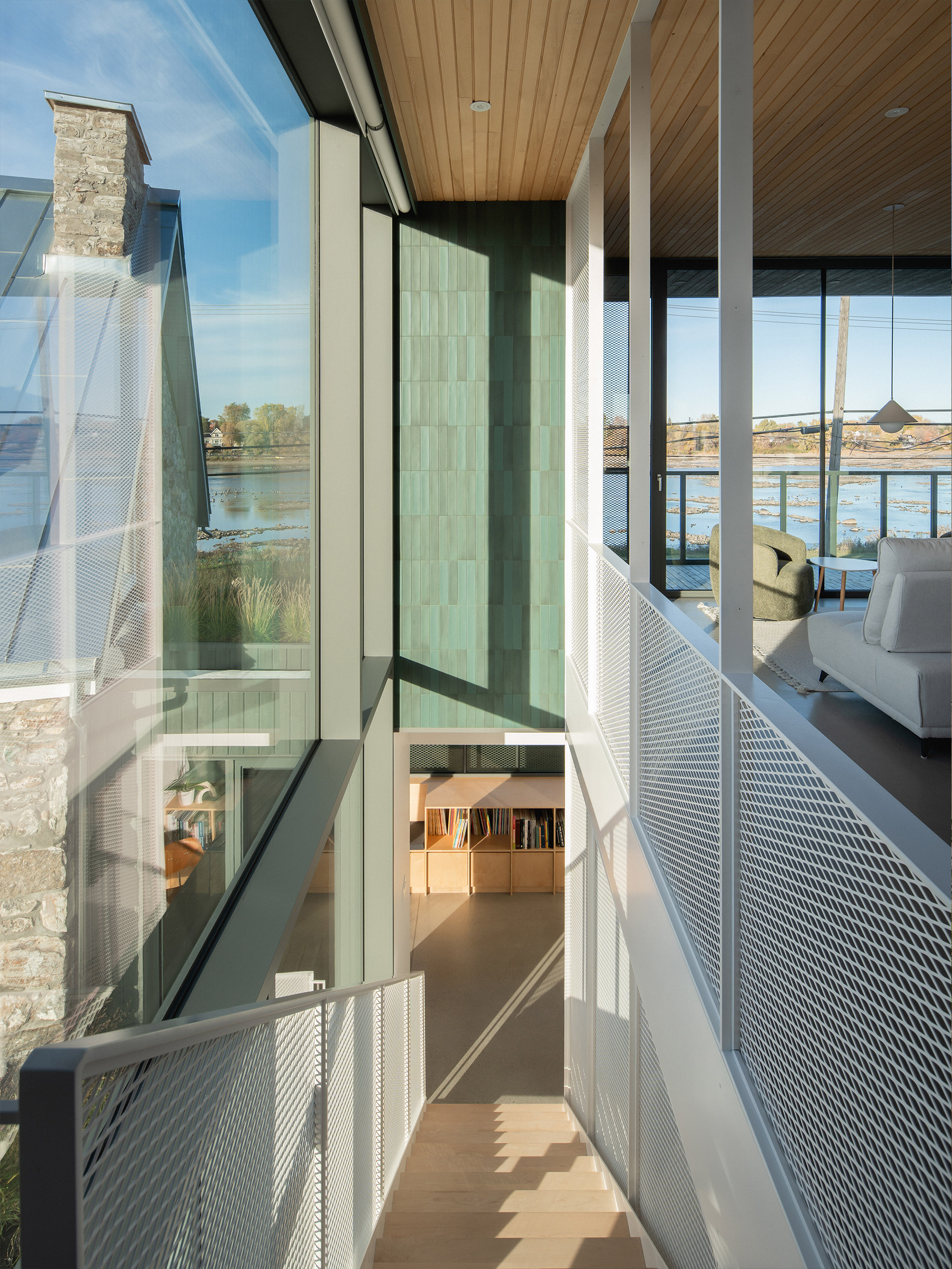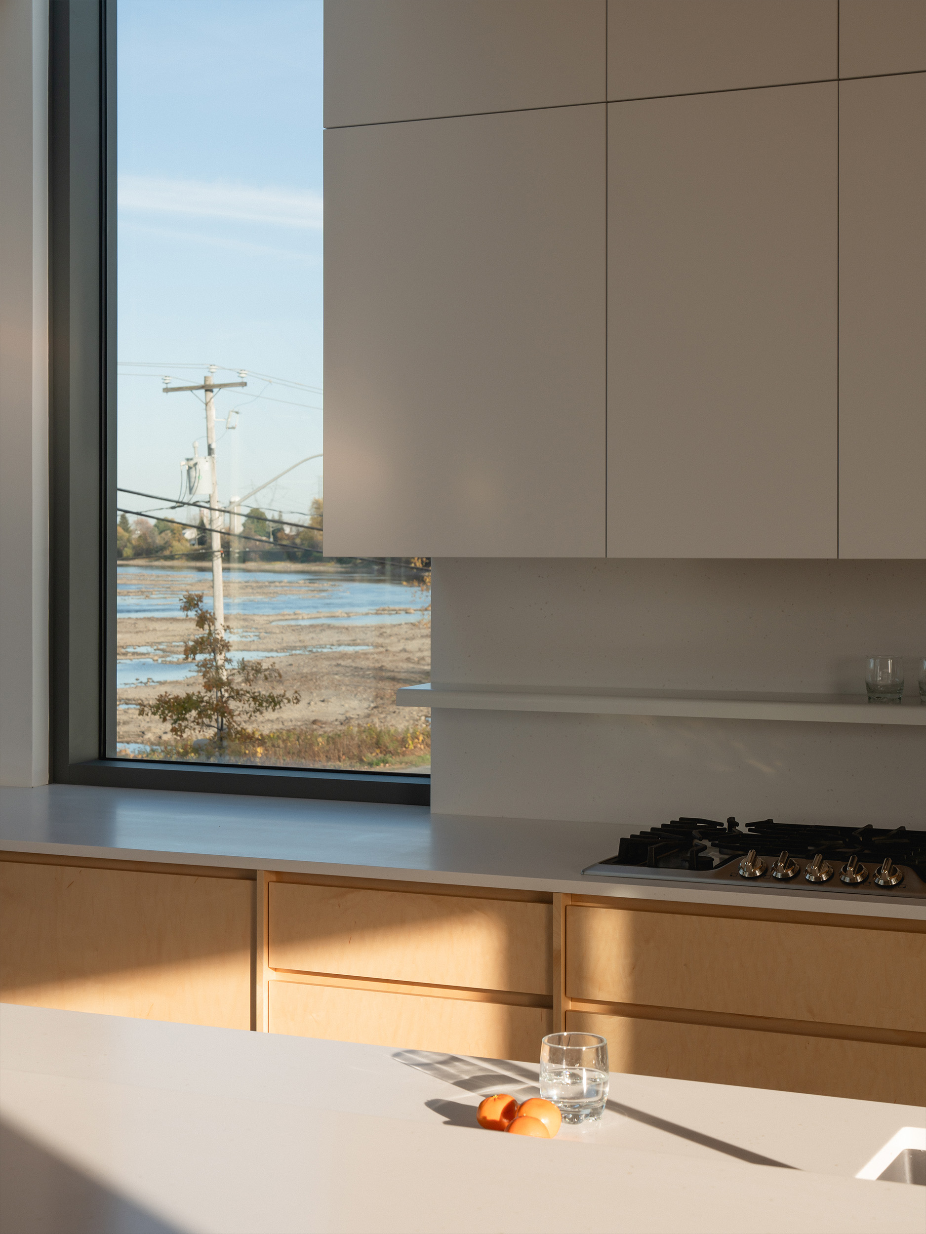 Located along the Mille-Îles river within an agricultural setting, the house maintains a privileged relationship with the surrounding landscape. The living spaces are oriented toward both the river and the fields, offering open views while preserving the privacy of the occupants.