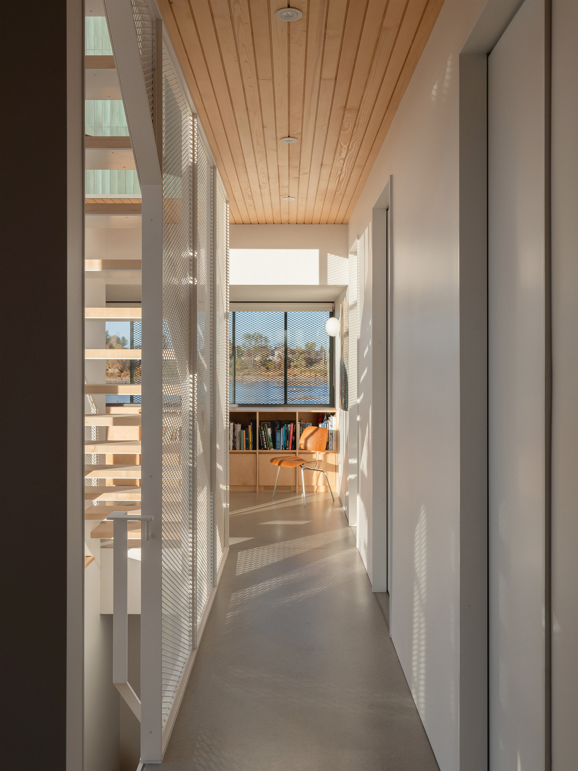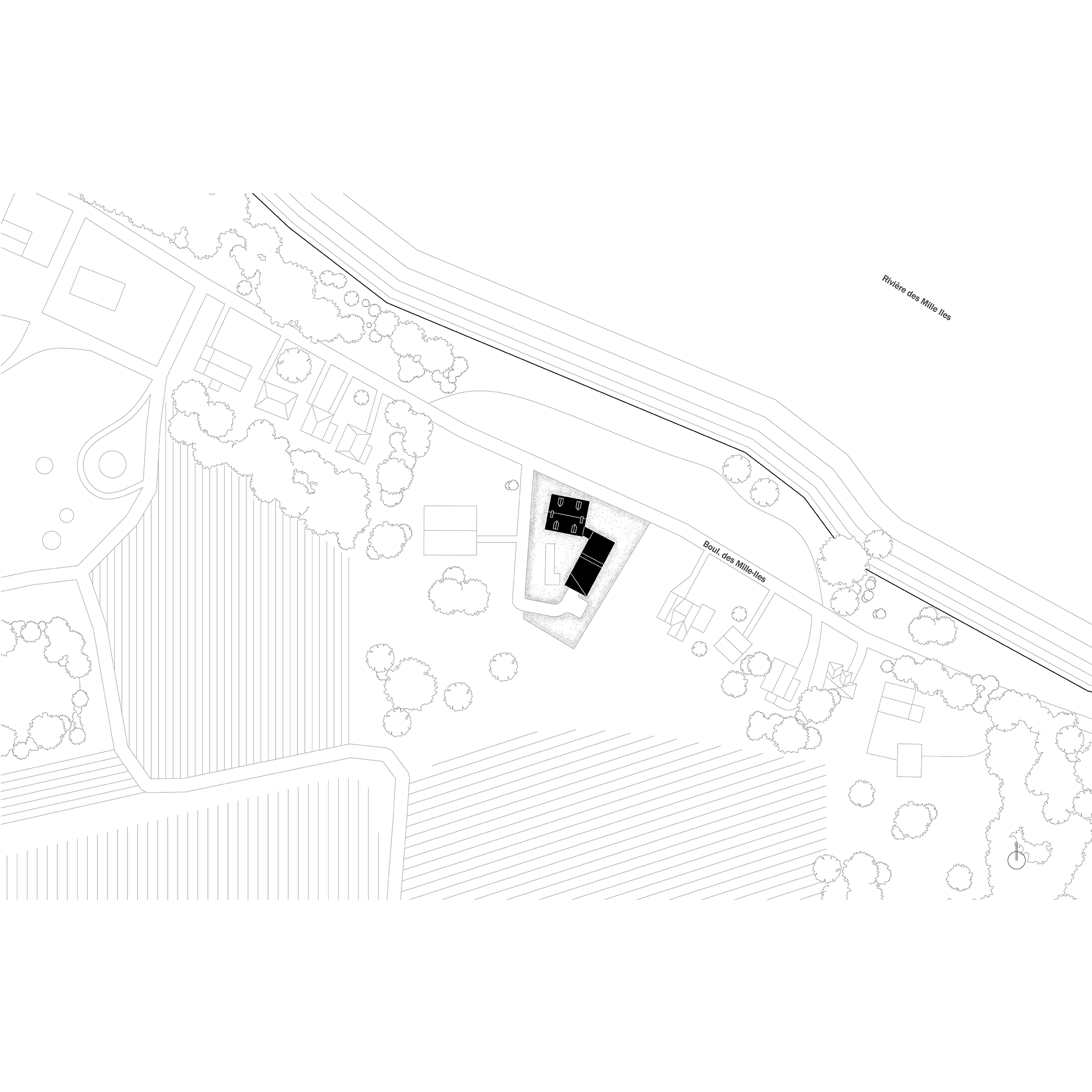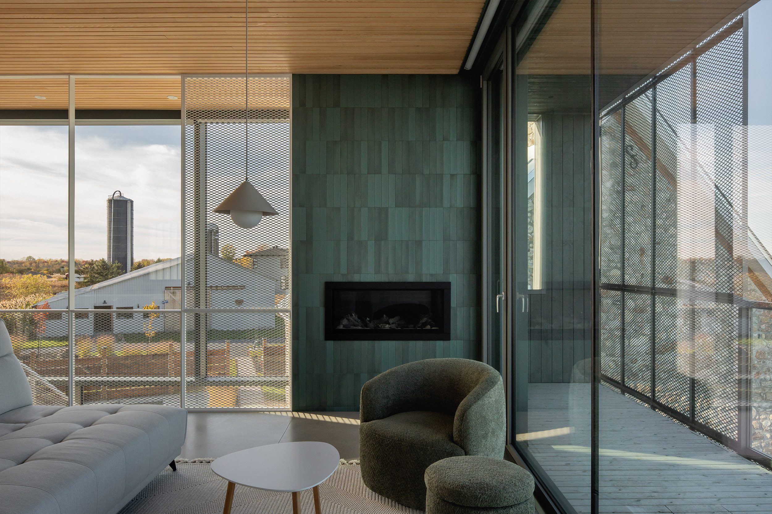 Located along the Mille-Îles river within an agricultural setting, the house maintains a privileged relationship with the surrounding landscape. The living spaces are oriented toward both the river and the fields, offering open views while preserving the privacy of the occupants.